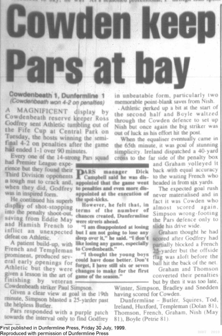 Tuesday, 27th Jul 1999 Match Report 30/07/1999 (Cowdenbeath(a))
